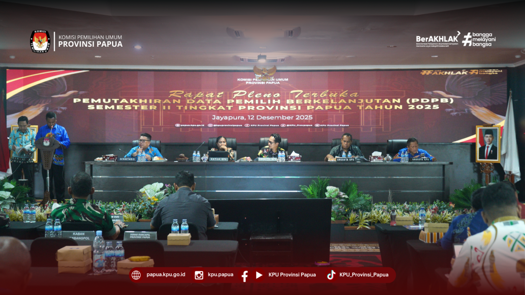 #Temanpemilih, Bertempat di lantai 4 Gedung KPU Provinsi Papua, telah dilaksanakan Rapat Pleno Rekapitulasi Pemutakhiran Data Pemilih Berkelanjutan (PDPB) Semester II tingkat Provinsi Papua Tahun 2025, Jumat (12/12/2025). Rapat Pleno Rekapitulasi Pemutakhiran Data Pemilih Berkelanjutan (PDPB) ini dihadiri oleh Bawaslu Provinsi Papua, stakeholder terkait yaitu Polda Papua, Kodam XVII Cenderawasih, Lanud Silas Papare, dan Kodaeral X Jayapura serta 9 KPU Kabupaten/kota se Papua. Rapat Pleno yang dipimpin oleh Ketua KPU Provinsi Papua, Diana Simbiak didampingi oleh Kadiv Rendatin Amijaya Halim, Kadiv Hukum dan Pengawasan Yohannes Fajar I. Kambon dan Kadiv Teknis Penyelenggaraan Pemilu Abd. Hadi, menetapkan 756.038 pemilih yang termaktub dalam Surat Keputusan Nomor: 855 tahun 2025. . . #KPUmelayani #KPUProvinsiPapua ....