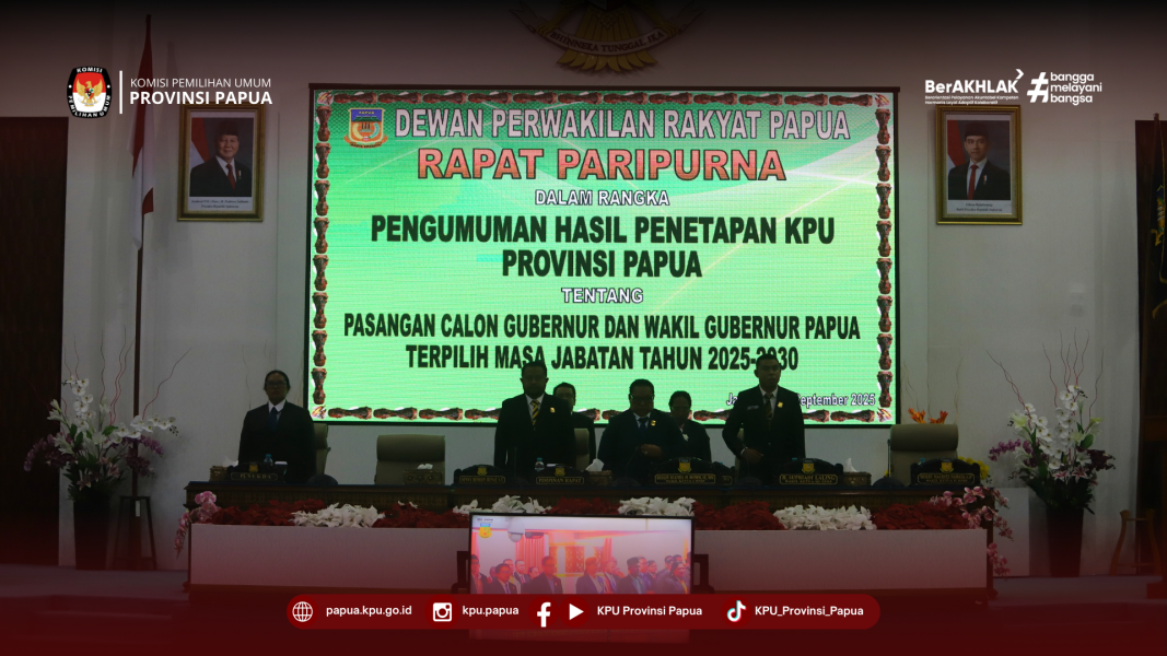 KPU Provinsi Papua turut menghadiri Rapat Paripurna DPR Papua yang digelar pada Senin malam, 22 September 2025, di ruang sidang DPR Papua. Agenda utama rapat tersebut adalah pengumuman hasil penetapan KPU Papua terkait pasangan Gubernur dan Wakil Gubernur Papua terpilih periode 2025–2030.