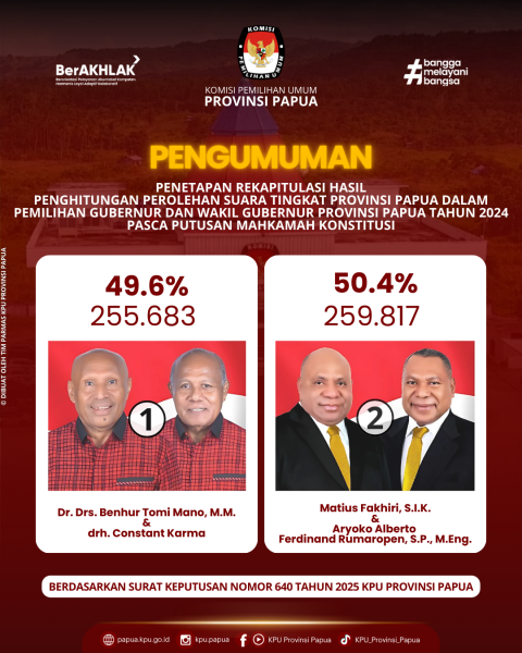 #Temanpemilih, Pengumuman Penetapan Rekapitulasi Hasil Penghitungan Perolehan Suara Tingkat Provinsi Papua Dalam Pemilihan Gubernur Dan Wakil Gubernur Provinsi Papua Tahun 2024 Pasca Putusan Mahkamah Konstitusi