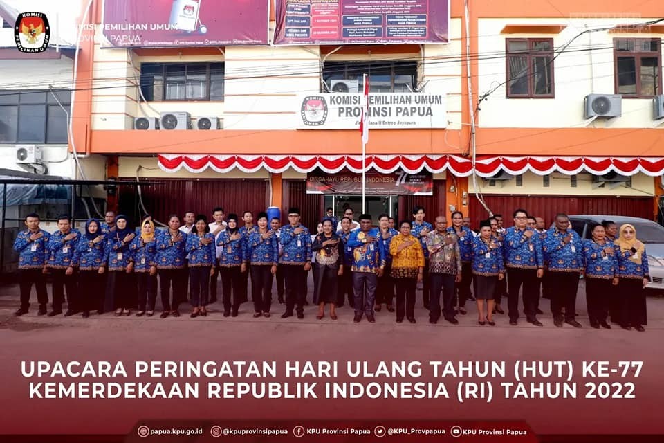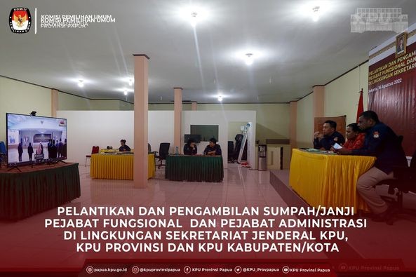 #TemanPemilih, KPU Provinsi Papua yang dihadiri oleh Ketua KPU Provinsi Papua Diana Dorthea Simbiak, Sekretaris KPU Provinsi Papua Ryllo Ashuri Panay, Kabag Hukum dan SDM Krispus Kambuaya, Kabag Perencanaan, Data dan Informasi Allen A. Pongoh, dan Kasubag Data dan Informasi Syeni Rasa, menghadiri Pelantikan Dan Pengambilan Sumpah/Janji Pejabat Fungsional dan Pejabat Administrasi di Lingkungan Sekretariat Jenderal KPU, KPU Provinsi dan KPU Kabupaten/Kota yang terdiri dari 1 Penata Kelola Pemilihan Umum Ahli Utama, 5 Penata Kelola Pemilihan Umum Ahli Madya, 3 Penata Kelola Pemilihan Umum Ahli Muda, 1 Analis Pengelola Keuangan APBN Ahli Muda, 1 Analis Hukum Ahli Muda, 48 Pejabat Administrator dan 6 Pejabat Pengawas dilantik dan diambil Sumpah/Janji oleh Sekretaris Jenderal KPU Bernad Dermawan Sutrisno secara luring dan daring, Selasa (16/08/2022).