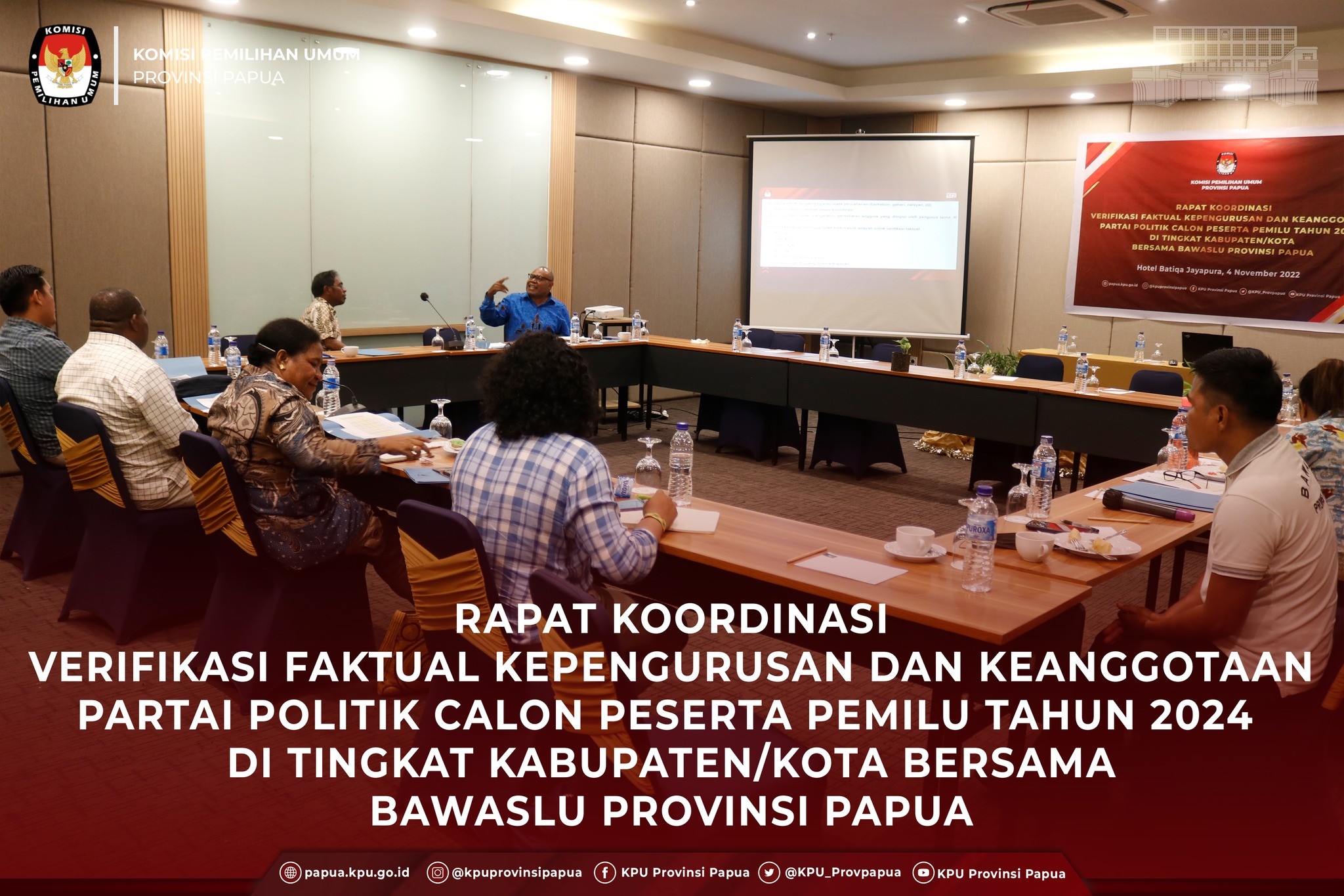 #TemanPemilih KPU Provinsi Papua mengadakan Rapat Koordinasi Verifikasi Faktual Kepengurusan dan Keanggotaan Partai Politik Calon Peserta Pemilu Tahun 2024 di Tingkat Kabupaten/Kota Bersama Bawaslu Provinsi Papua, di Batiqa Hotel Jayapura, Jumat (4/11).