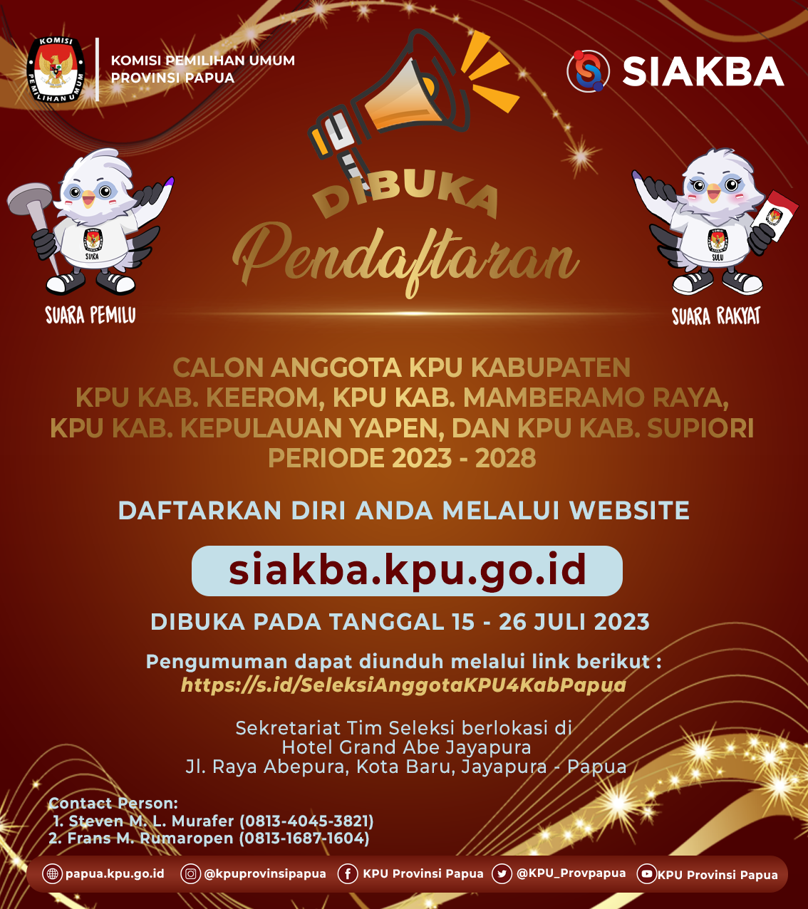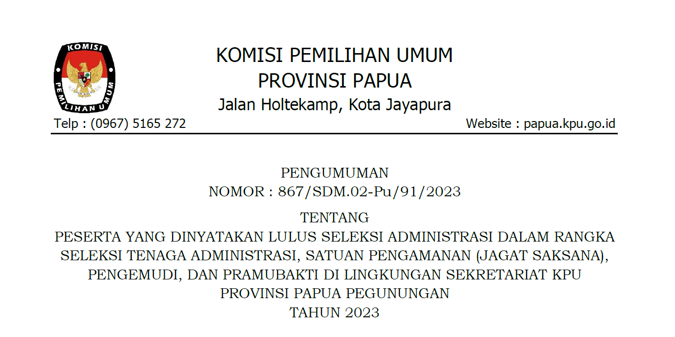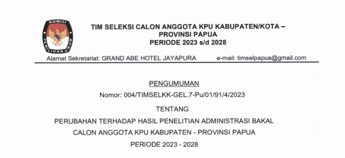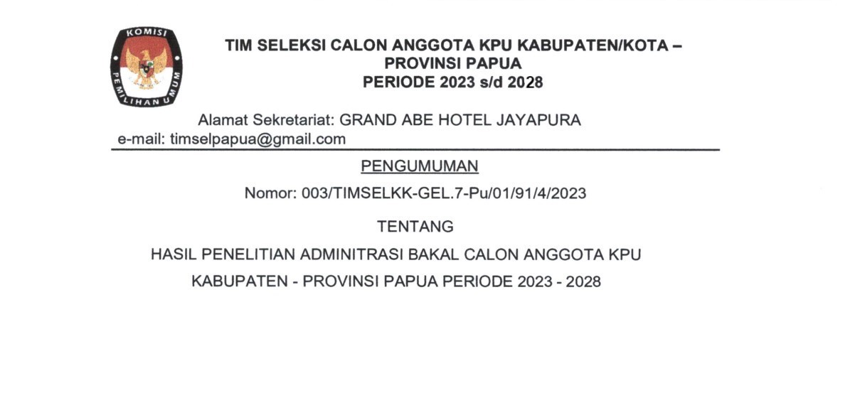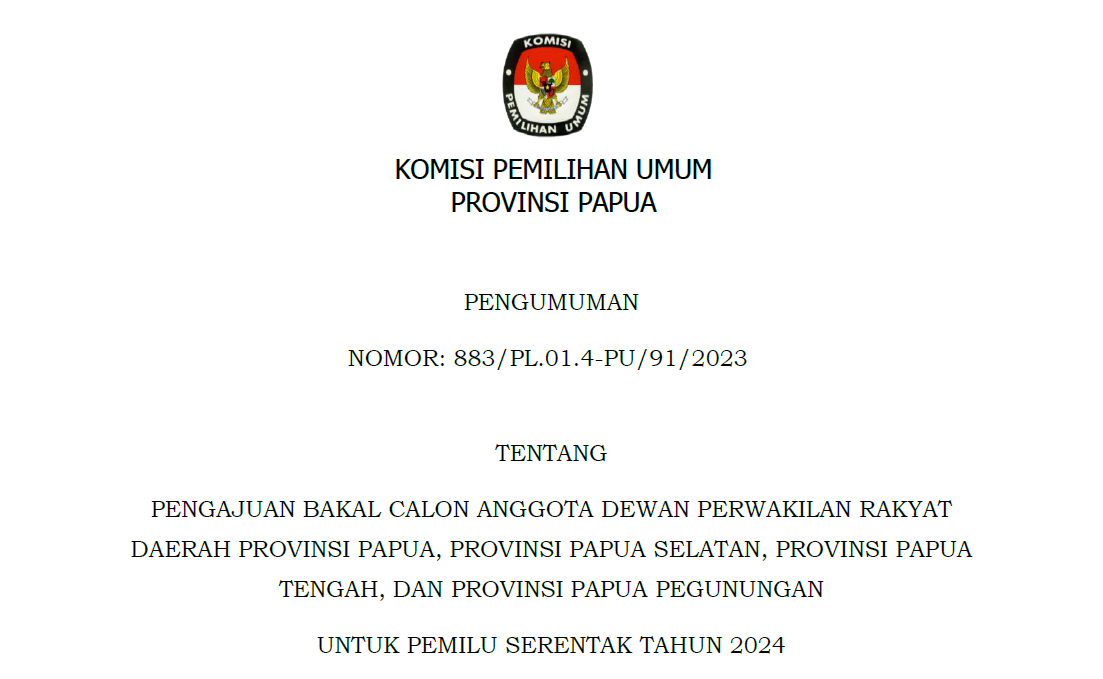 Komisi Pemilihan Umum Provinsi Papua, Komisi Pemilihan Umum Provinsi Papua Selatan, Komisi Pemilihan Umum Provinsi Papua Tengah, dan Komisi Pemilihan Umum Provinsi Papua Pegunungan membuka penerimaan pengajuan bakal calon anggota Dewan Perwakilan Rakyat Daerah (DPRD) Provinsi Papua, Provinsi Papua Selatan, Provinsi Papua Tengah, dan Provinsi Papua Pegunungan untuk Pemilu Serentak Tahun 2024 melalui Partai Politik Peserta Pemilu pada kepengurusan tingkat Provinsi