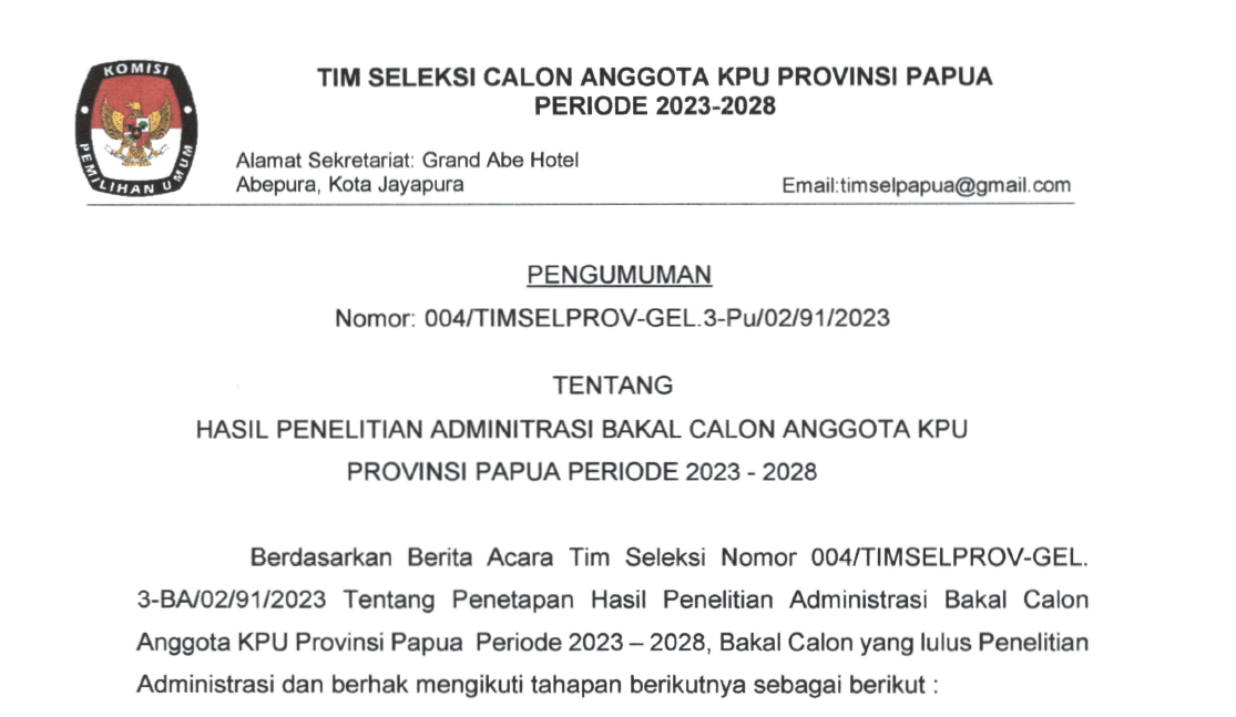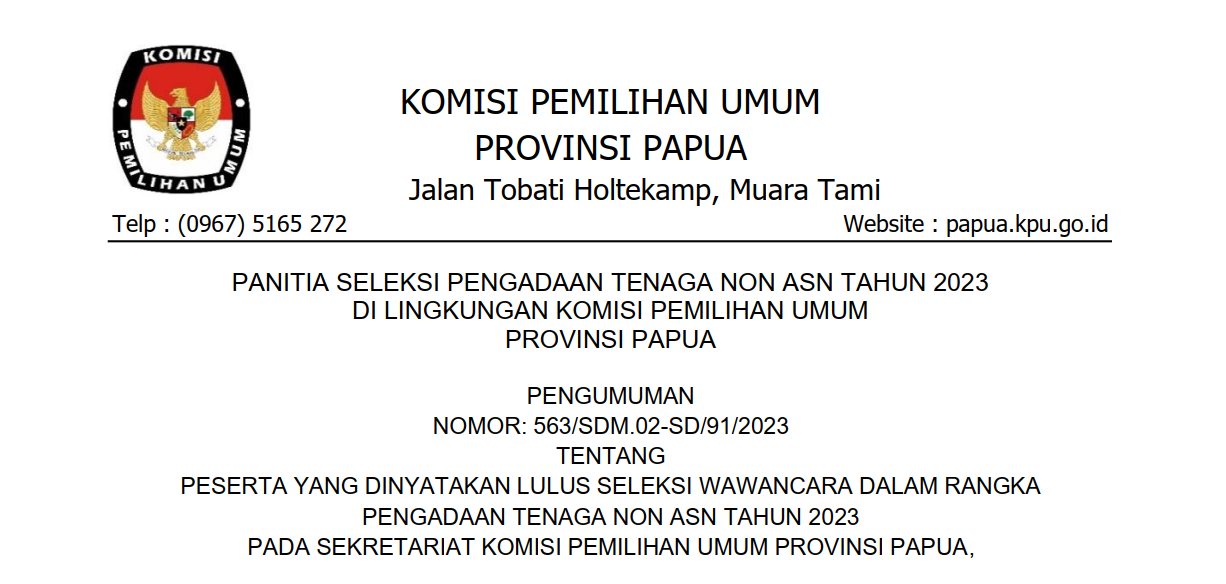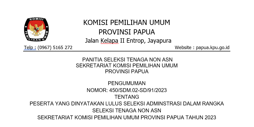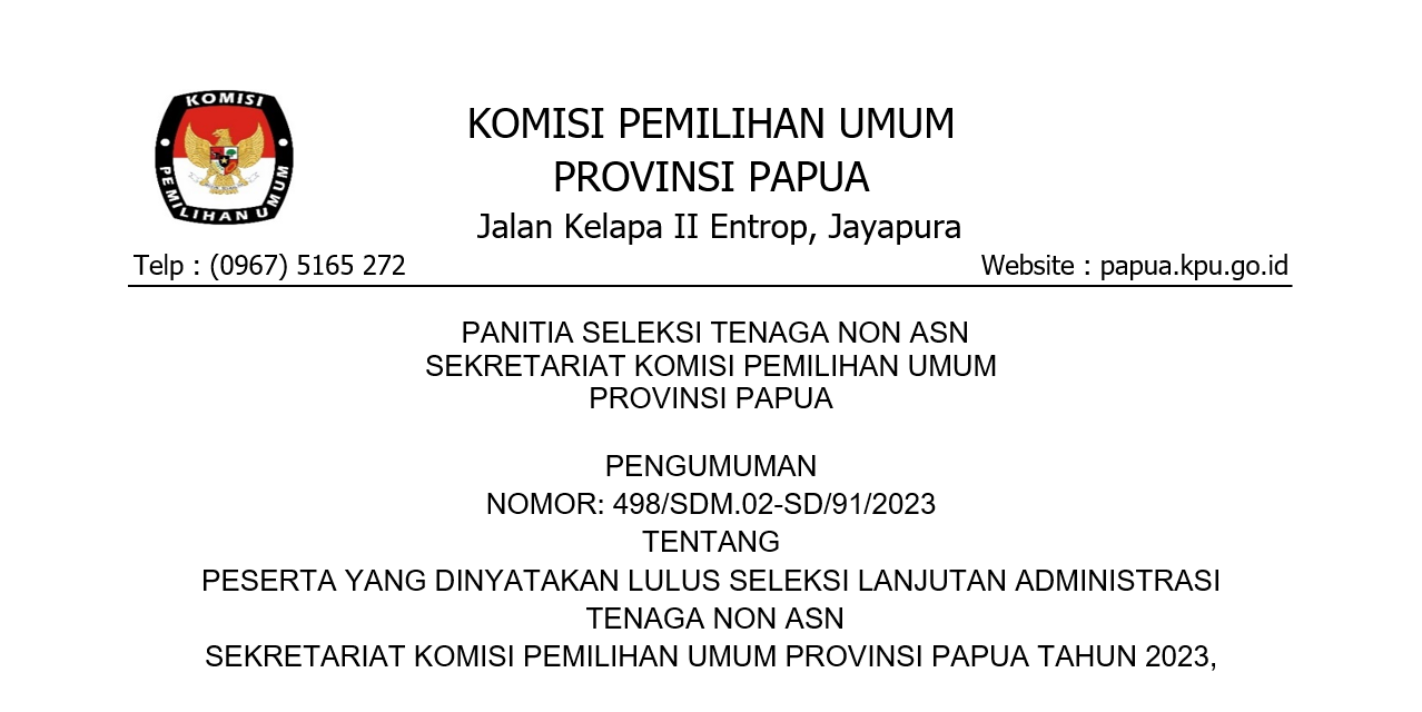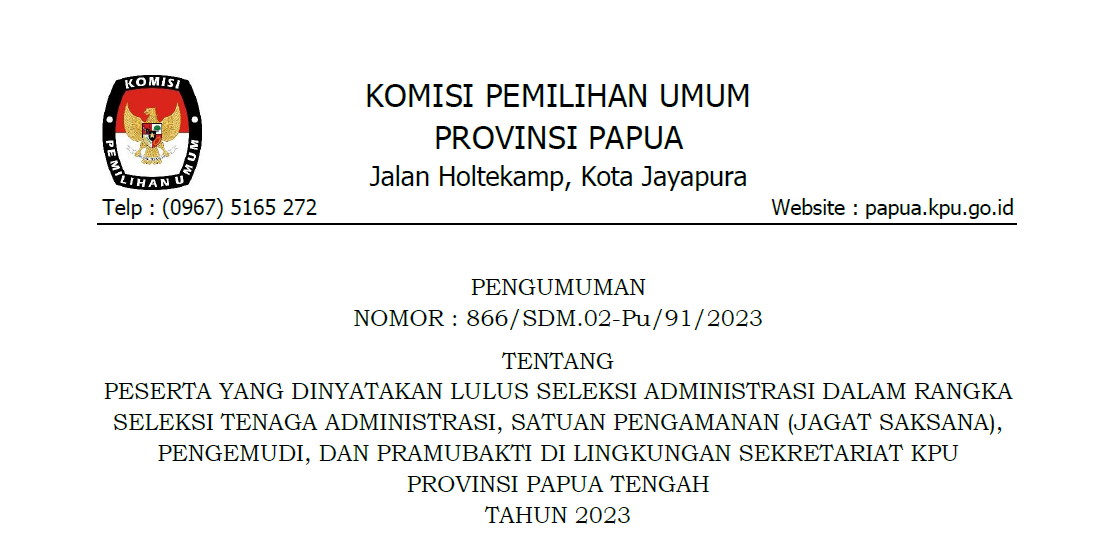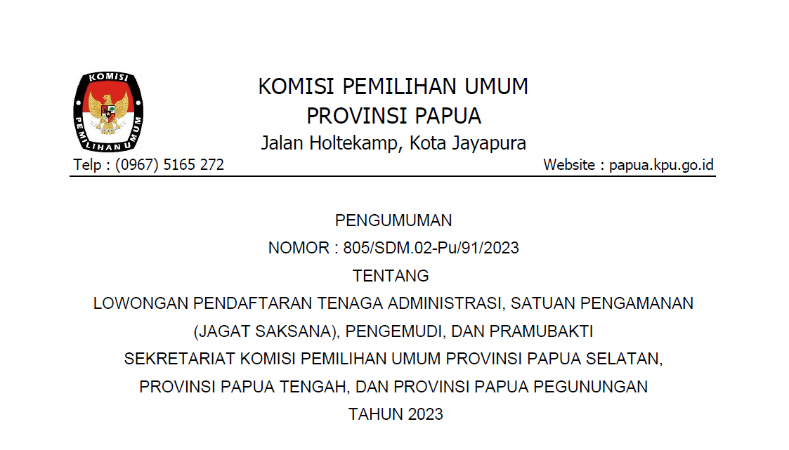 Pengumuman Lowongan Pendaftaran Tenaga Administrasi, Satuan Pengamanan (Jagat Saksana), Pengemudi, Dan Pramubakti Sekretariat Komisi Pemilihan Umum Provinsi Papua Selatan, Provinsi Papua Tengah, Dan Provinsi Papua Pegunungan Tahun 2023